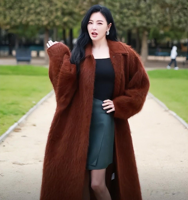 绮姐的下半身是一条墨绿色的包臀皮裙,身上还套了一件深棕色的毛绒大衣。